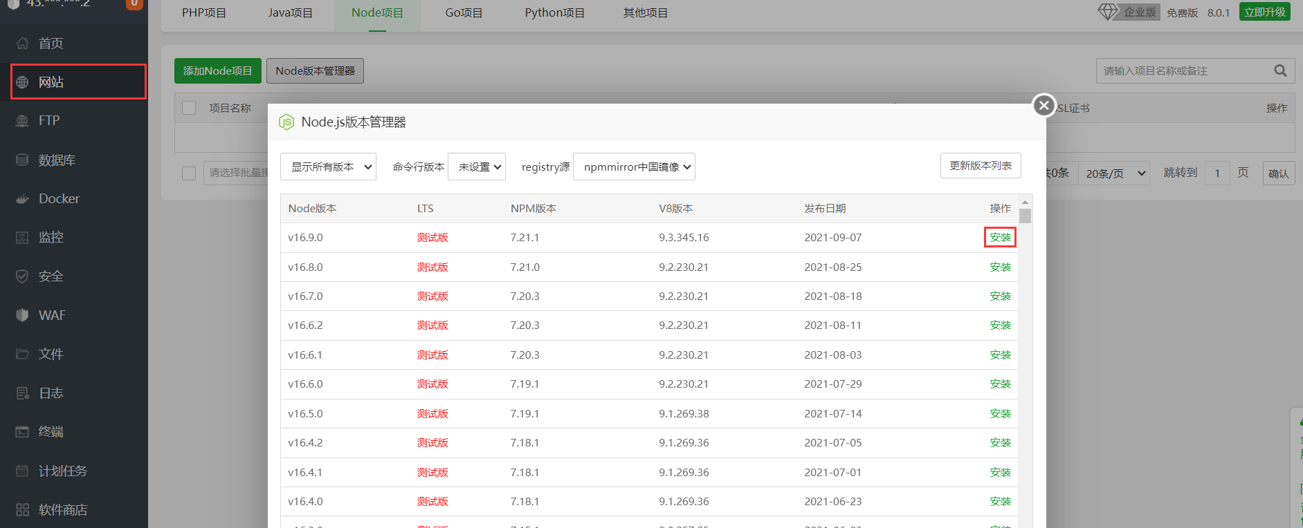 进入网站管理,点击Node项目,首次进入需要安装版本管理器,选择一个版本安装即可。