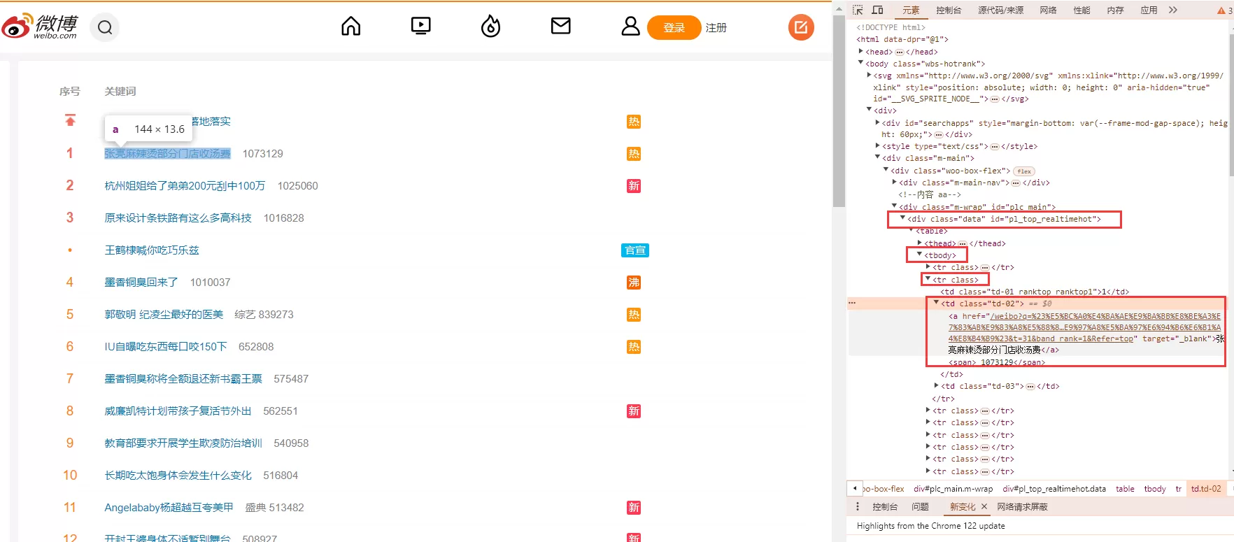 打开浏览器开发者工具,在页面结构中提取出微博热搜相关dom结构,只要是能准确定位到所需要的dom结构即可。